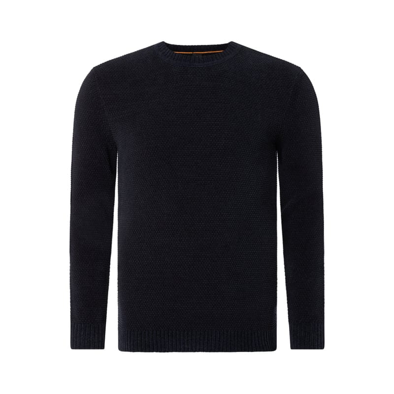 Sweter męski BOSS , Mieszanka bawełny z dodatkiem streczu , Prosty krój , Aksamitna przędza , Oczka z fakturą , Okrągły dekolt , Prążkowane ściągacze , Logo na dole , Długość tyłu w rozmiarze XXL: 73 cm, Długość rękawa w rozmiarze XXL: 68 cm