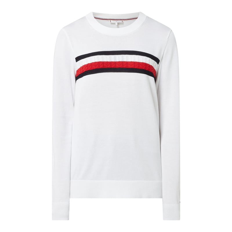 Sweter damski Tommy Hilfiger , Czysta bawełna ekologiczna , Taliowany krój, Okrągły dekolt , Paski w kontrastowym kolorze ze ściegiem warkoczowym , Długość tyłu w rozmiarze S: 62 cm, Długość rękawa w rozmiarze S: 65 cm