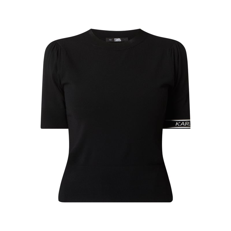Sweter damski KARL LAGERFELD, Mieszanka wiskozy , Wąski krój , Drobne oczka , Okrągły dekolt , Krótkie rękawy ze ściągaczami z logo, Długość tyłu w rozmiarze S: 50 cm