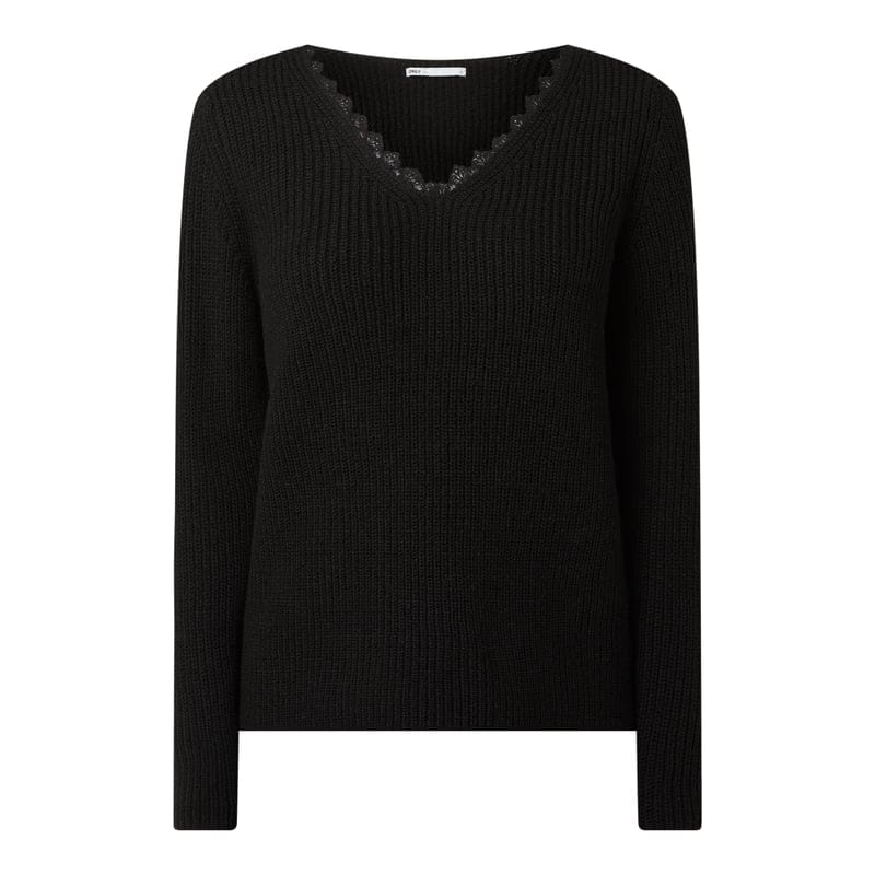 Sweter damski ONLY , Miękki materiał , Luźny krój, Prążkowana faktura , Dekolt w serek z ozdobną tasiemką z ażurowej koronki , Długość tyłu w rozmiarze S: 58 cm, Długość rękawa w rozmiarze S: 61 cm