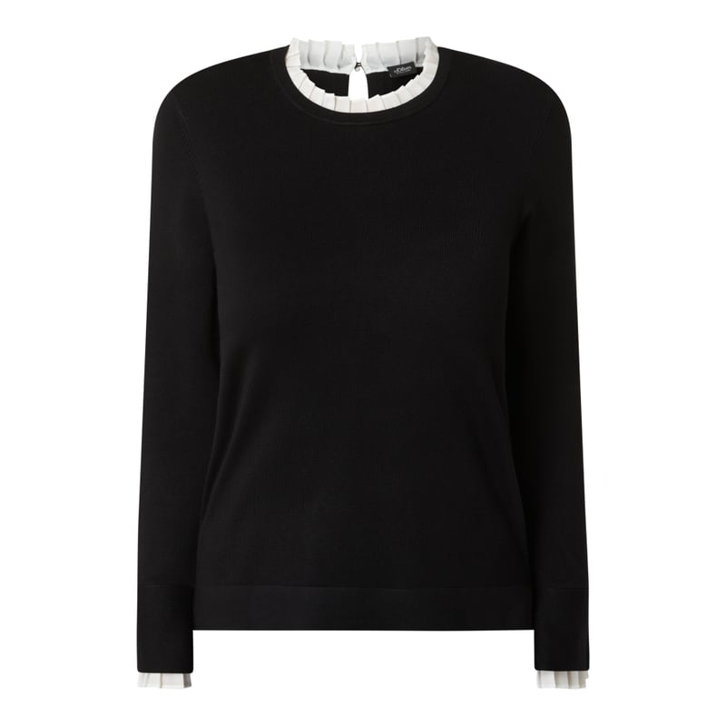Sweter damski s.Oliver BLACK LABEL, Mieszanka wiskozy z dodatkiem streczu , Wąski krój, Drobne oczka , Okrągły dekolt, Długie rękawy , Plisowane zakończenia w kontrastowym kolorze, Wycięcie w kształcie łezki zapinane na guzik z tyłu , Długość tyłu w rozmiarze 36: 54,5 cm , Długość rękawa w rozmiarze 36: 55,5 cm