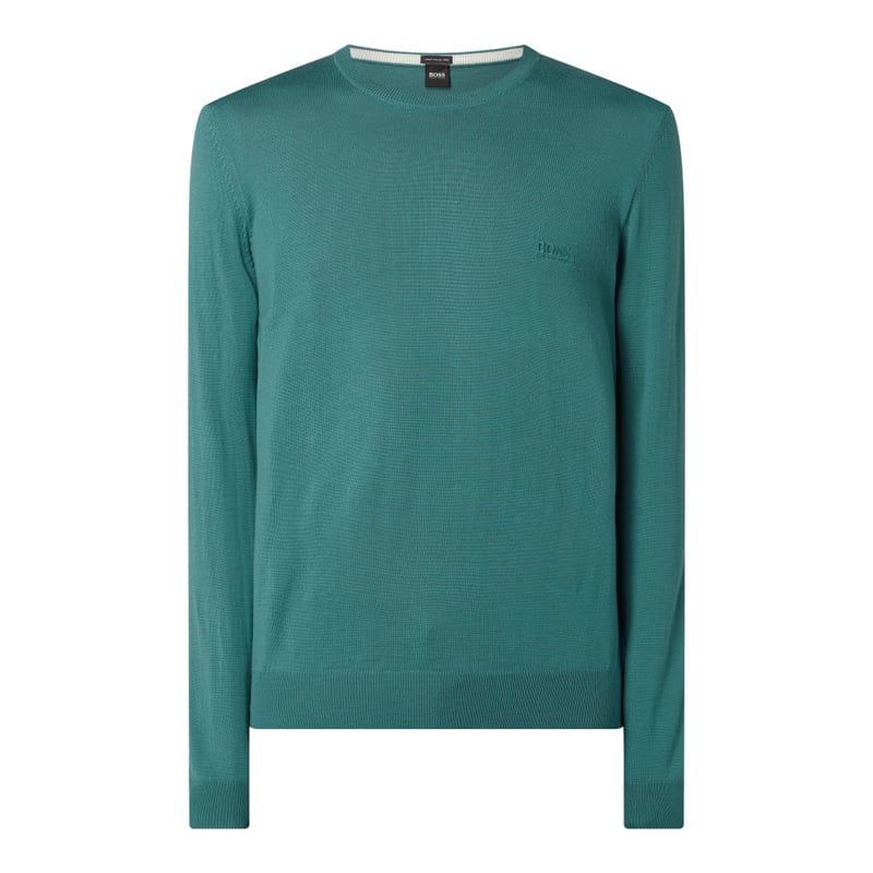 Sweter męski BOSS , Czysta żywa wełna, Luźny krój, Okrągły dekolt , Wyhaftowane logo, Długość tyłu w rozmiarze M: 65 cm, Długość rękawa w rozmiarze M: 67 cm