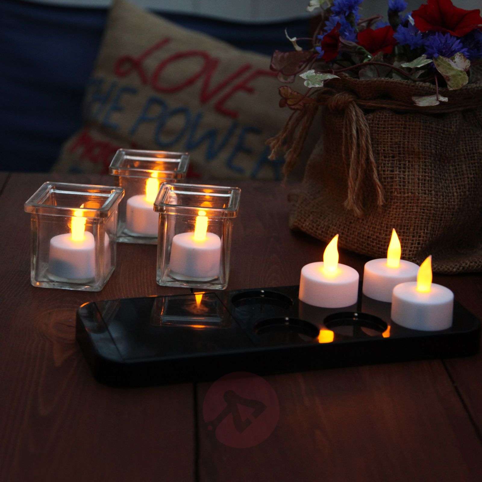 Do ponownego ładowania: nastrojowy 6-częściowy zestaw świeczek tealight z solarną stacją ładującą Świeczki z 6-częściowego zestawu tealight w ciepły letni wieczór roztoczą wokół siebie przytłumiony, romantyczny blask, umożliwiając różnorakie nastrojowe aranżacje. Poszczególne akumulatory świeczek w ciągu dnia ładują się w stacji ładującej bezpłatnym prądem solarnym, który nocą zasila źródła LED. Kolejne zalety świeczek LED to brak sadzy oraz nagrzewania się. Pod każdą ze świeczek znajduje się włącznik/wyłącznik. Akumulator: 6 x 80H NiMH 2,4V 80mAh Klasa efektywności energetycznej: A+