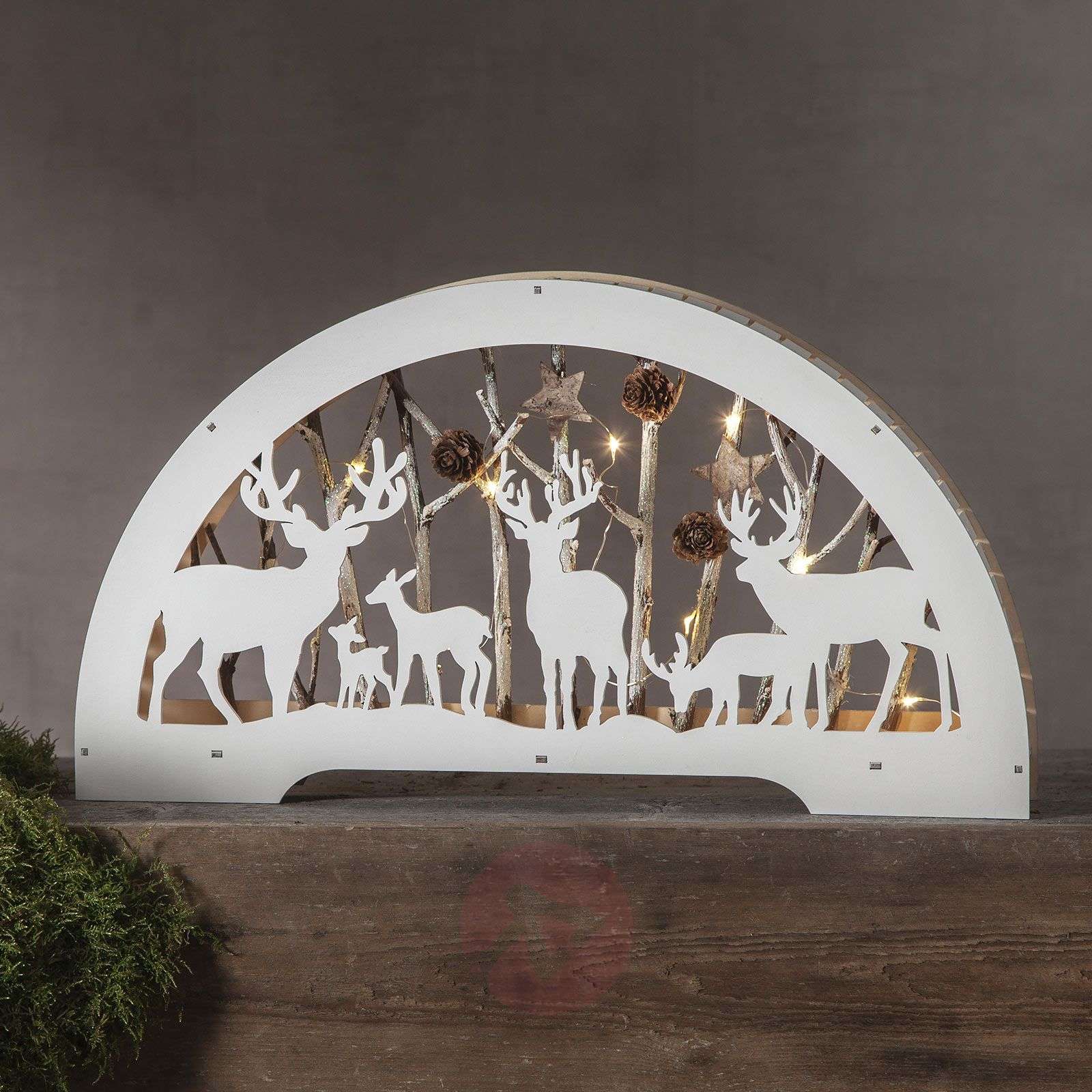 Łagodnie podświetlany świecznik LED Fauna Świecznik LED Fauna roztacza bardzo przyjemny nastrój świetlny. Z białego lakierowanego drewna misternie wyrzeźbiono leśną scenę z jeleniami i sarnami, która jest delikatnie oświetlona diodami LED o barwie ciepłej bieli. Wyboru miejsca na tę atrakcyjną dekorację świąteczną można dokonać bez względu na gniazdo wtykowe. Świecznik zasilany jest przez dwie baterie AA. Baterie nie są zawarte w zestawie ze świecznikiem, można je nabyć oddzielnie w dziale „Akcesoria dodatkowe”. Lampa jest wyposażona w przełącznik.