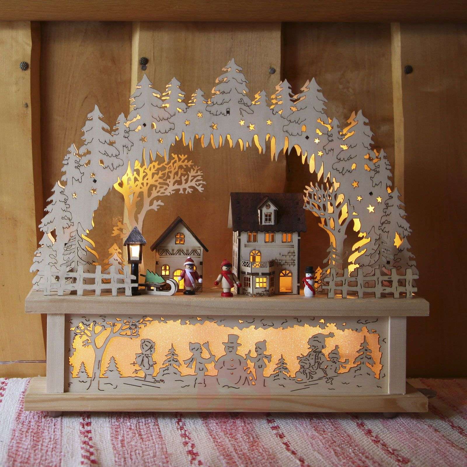 Świecznik LED Rosenheim: możliwe zasilanie z baterii lub z transformatora do wyboru Szczegółowo wykonany świecznik LED Rosenheim z drewna w kolorze naturalnym, którego motywy i oświetlenie rozciągają się również nad oprawą, co czyni z niego uniwersalny dodatek do dekoracji świątecznej. Świecznik można według życzeń podłączyć do sieci lub zasilić bateriami. Transformator jest już dołączony do kompletu, baterie (3 x AA) nie są dołączone i można je nabyć oddzielnie w dziale „Akcesoria dodatkowe”.