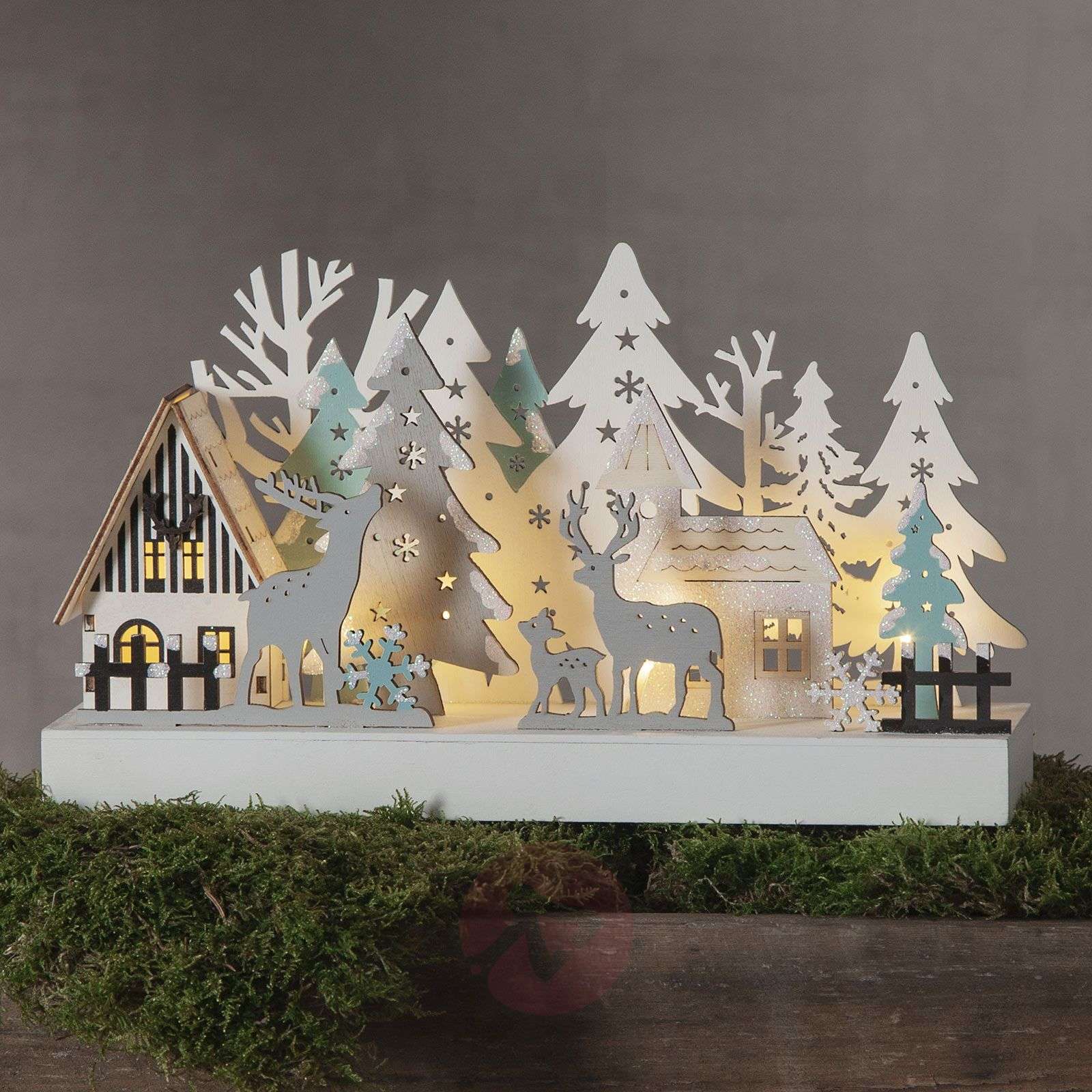 Świecznik okienny Reinbeck z zimową leśną sceną Świecznik okienny Reinbeck przyciąga wzrok nawet wówczas, gdy nie jest podświetlony: poszczególne motywy leśnej sceny zostały bardzo plastycznie wykonane z drewna. Sceneria jest szczególnie imponująca, gdy tylko włączy się oświetlenie, a diody LED o barwie ciepłej bieli emitują miękkie światło. Wspaniała ozdoba świąteczna, np. na parapet. - zasilanie bateryjne: 2 x AA (baterie nie wchodzą w skład zestawu, można je zamówić odrębnie w dziale „Akcesoria dodatkowe”).