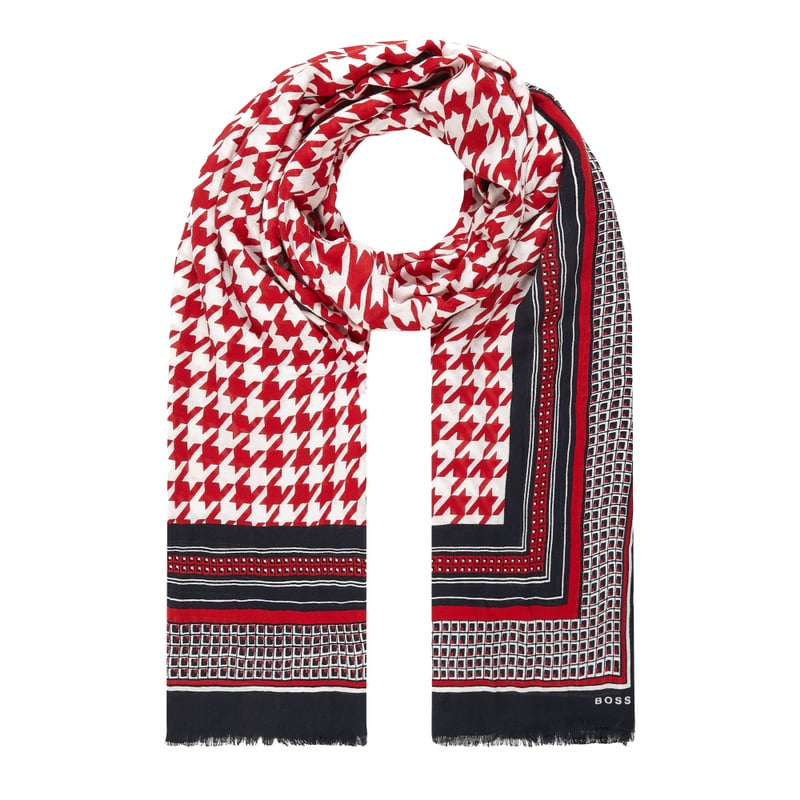 Szal damski BOSS, Mieszanka bawełny i modalu, Wzór w pepitkę, Brzegi w kontrastowym kolorze, Delikatne frędzelki na brzegach, Logo, 176 x 121 cm