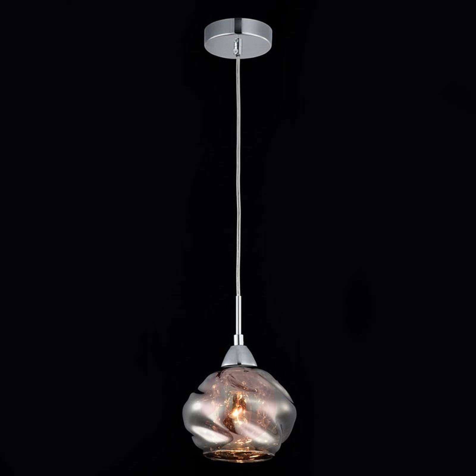 Z przepiękną kryształową ozdobą i szklanym kloszem w kolorze szarego dymu Lampa wisząca Haze W kolorze szarego dymu i o lekko pogniecionym wyglądzie – tak wygląda szklany klosz lampy wiszącej Haze, która w każdym pomieszczeniu w mieszkaniu przyciąga wzrok. Szczególnie po zaświeceniu lampa pokazuje się ze swojej najpiękniejszej strony, ponieważ kryształy znajdujące się we wnętrzu klosza po oświetleniu światłem zaczynają wspaniale migotać i błyszczeć, co tworzy magiczny wygląd i jedyną w swoim rodzaju atmosferę świetlną. Powierzchnia szkła o barwie szarego dymu oraz błyszczące chromowane metalowe zawieszenie sprawiają, że jest to lampa o wszechstronnym zastosowaniu. Klasa efektywności energetycznej: A++