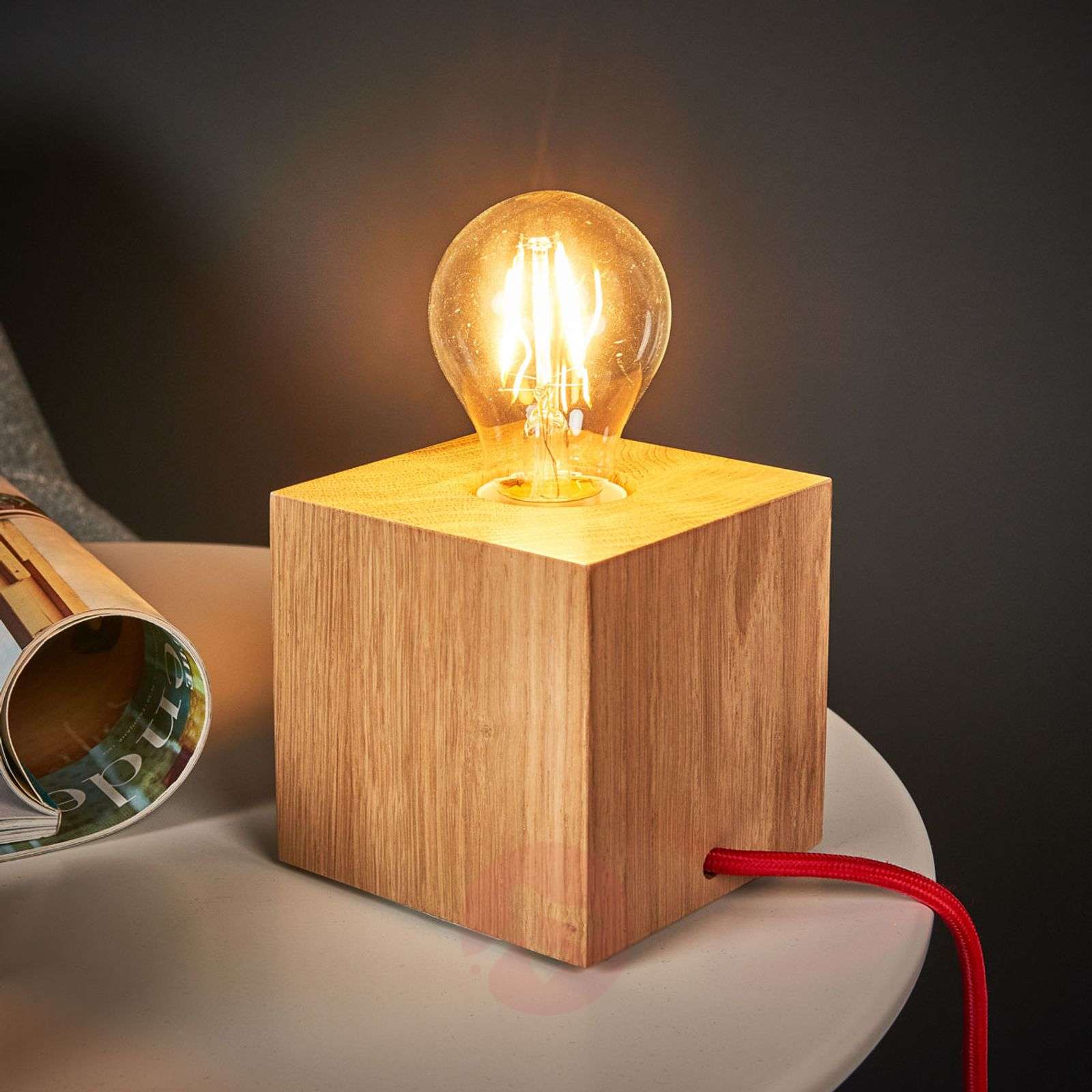 Wnosi do domu odrobinę natury: lampa stołowa Trongo Lampa stołowa Trongo po raz kolejny udowadnia, że często mniej oznacza więcej – a to dzięki purystycznemu i nieprzekłamanemu wyglądowi. Lampa, w której wyfrezowano oprawę E27, składa się jedynie z kwadratowej dębowej podstawy, której usłojenie prezentuje się szczególnie pięknie dzięki olejowanej powierzchni. Otwarta konstrukcja pozwala na swobodne przenikanie światła do pomieszczenia i tworzy szczególnie równomierny obraz. Kolorowy przewód zasilający, w którym zamontowany jest przełącznik dźwigniowy, to jeszcze jedna z wyjątkowych zalet tej oprawy. Klasa efektywności energetycznej: A++