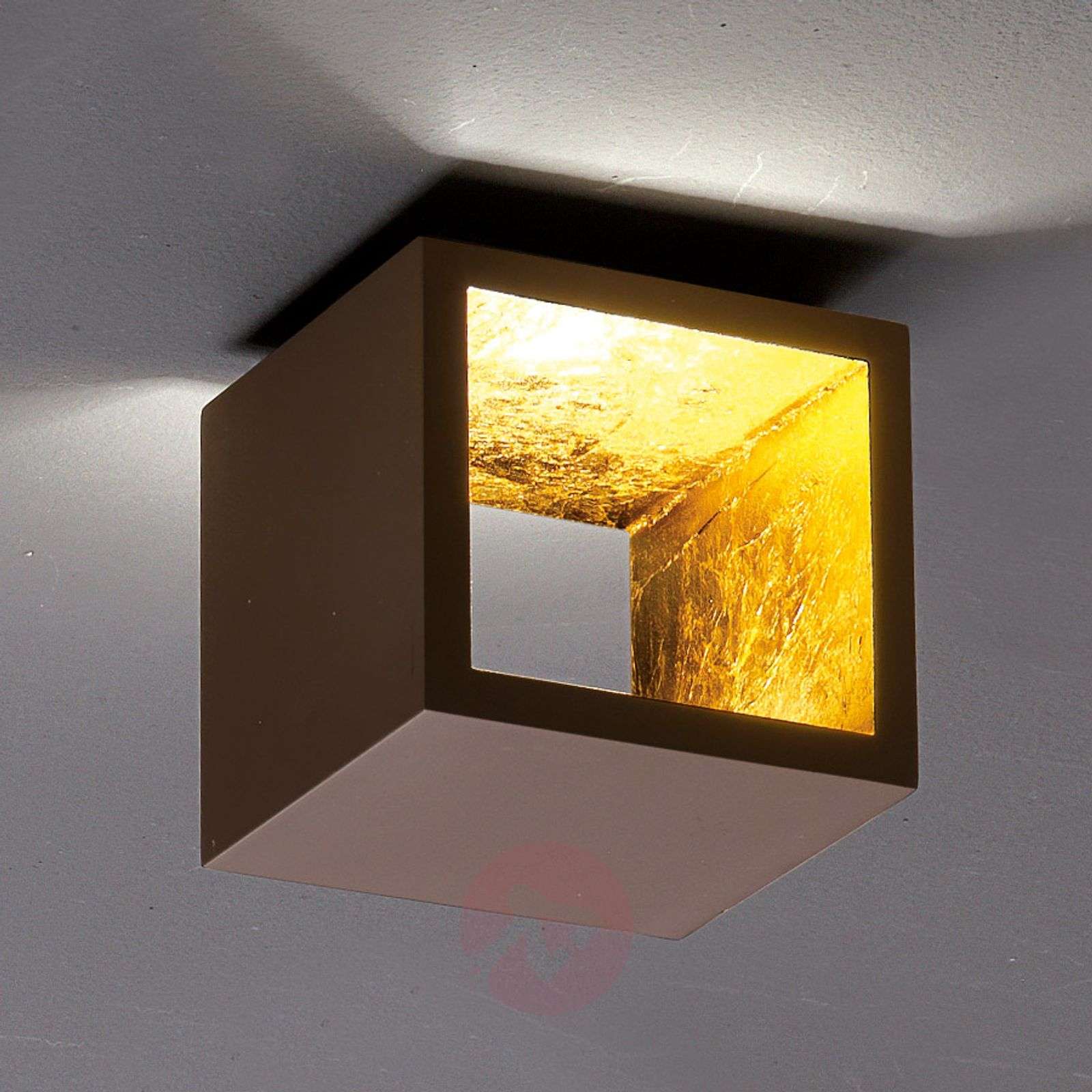 Sześcienna lampa LED CUBÒ ozdobiona złotem płatkowym To właśnie swojej sześciennej formie lampa ta zawdzięcza swoją nazwę – CUBÒ. Wewnętrzna strona otwartej, aluminiowej kostki została pokryta złotem płatkowym, która pięknie współgra z brązową częścią zewnętrzną. Po włączeniu światła złota powierzchnia tworzy efektowne akcenty. Lampa ta może posłużyć zarówno jako lampa sufitowa, jak i ścienna, która zapewni we wnętrzu pośrednie oświetlenie. Klasa efektywności energetycznej: A+