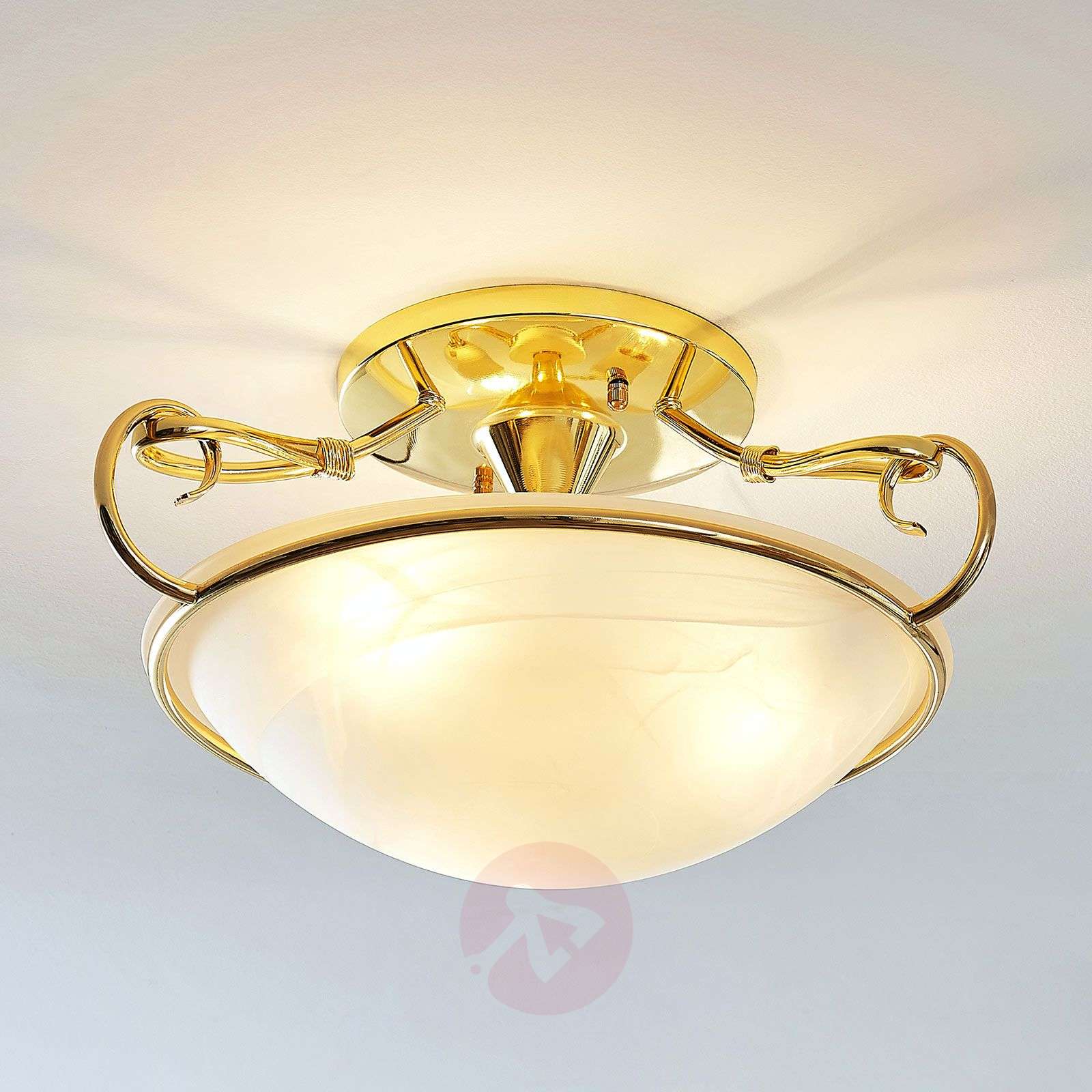 Okrągła lampa sufitowa Lonika o klasycznym wyrazie i powierzchni w stylu starego mosiądzu Lonika wspaniale komponuje się z klasycznymi stylami wyposażenia wnętrz i rozprzestrzenia odrobinę romantyzmu, a przede wszystkim tworzy piękny nastrój oświetleniowy. Kloszem jest szklana misa o powierzchni imitującej alabaster. Tworzy to bardzo przytulne światło dla pomieszczeń mieszkalnych. W górnej części znajduje się metalowa podstawa z atrakcyjnym wykończeniem w starym mosiądzu, która jest częściowo artystycznie zakrzywiona i dlatego nawiązuje do romantycznego stylu. Piękny dodatek do wystroju całej przestrzeni mieszkalnej i sypialni. Klasa efektywności energetycznej: A++
