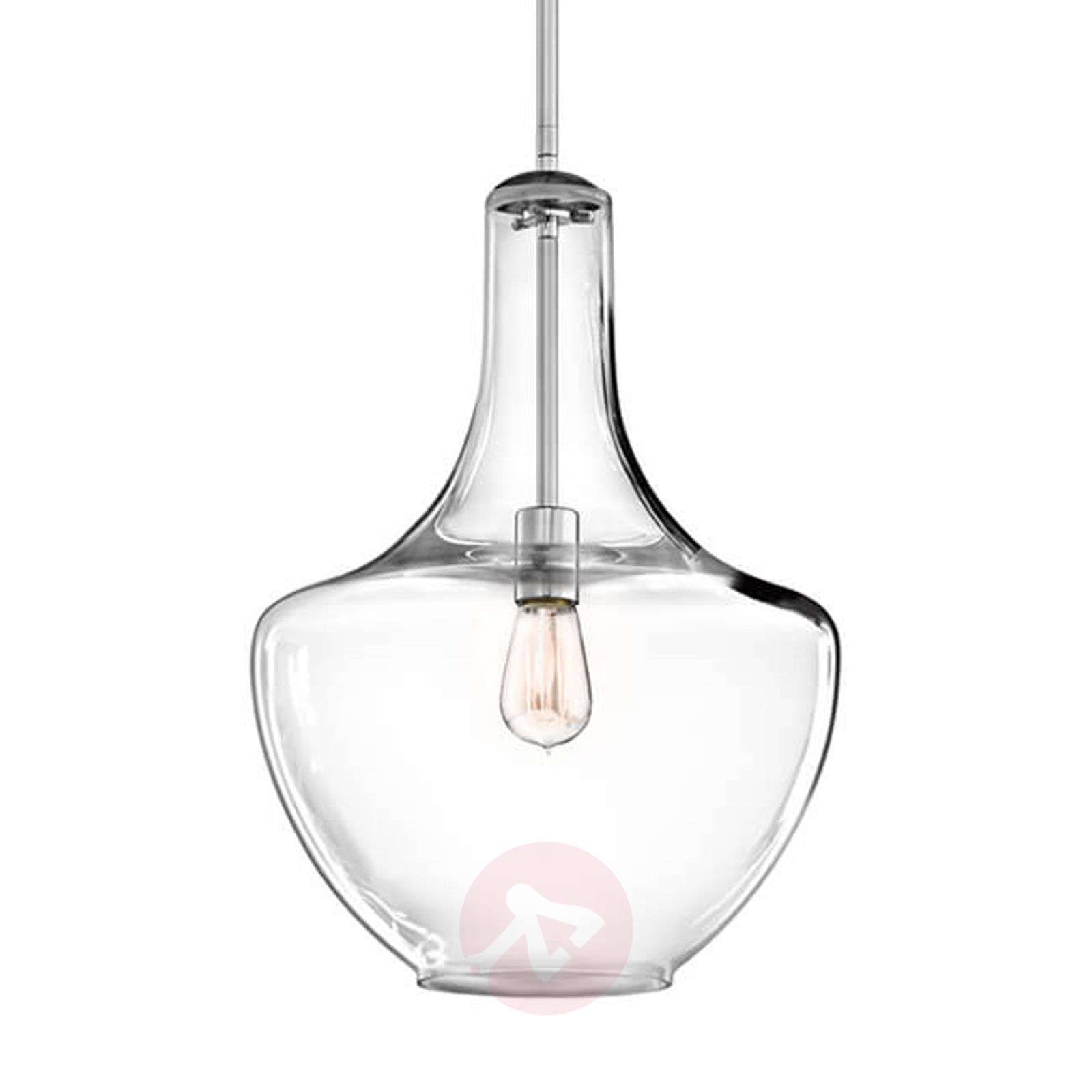 Przezroczysta szklana lampa wisząca Everly z widoczną oprawą Piękno lampy wiszącej Everly nie ogranicza się tylko do atrakcyjnego kształtu klosza z dmuchanego szkła, ale również ukazuje się odbiorcy dzięki temu, że żarówka zamontowana w oprawie jest widoczna. Oprawa, podobnie jak całe zawieszenie, jest błyszcząca, chromowana i odróżnia się od przezroczystego szkła. Gdy zastosujemy ozdobną żarówkę w stylu retro, efekt dekoracyjny tej lampy wiszącej, która może być łączona z wieloma stylami aranżacji wnętrz, ulegnie wzmocnieniu. Everly zapewnia na przykład także wspaniale kompleksowe oświetlenie otoczenia nad stołem w jadalni lub blatem kuchennym. - Żarówki w wersji retro dostępne są w dziale „Akcesoria dodatkowe” Klasa efektywności energetycznej: A++