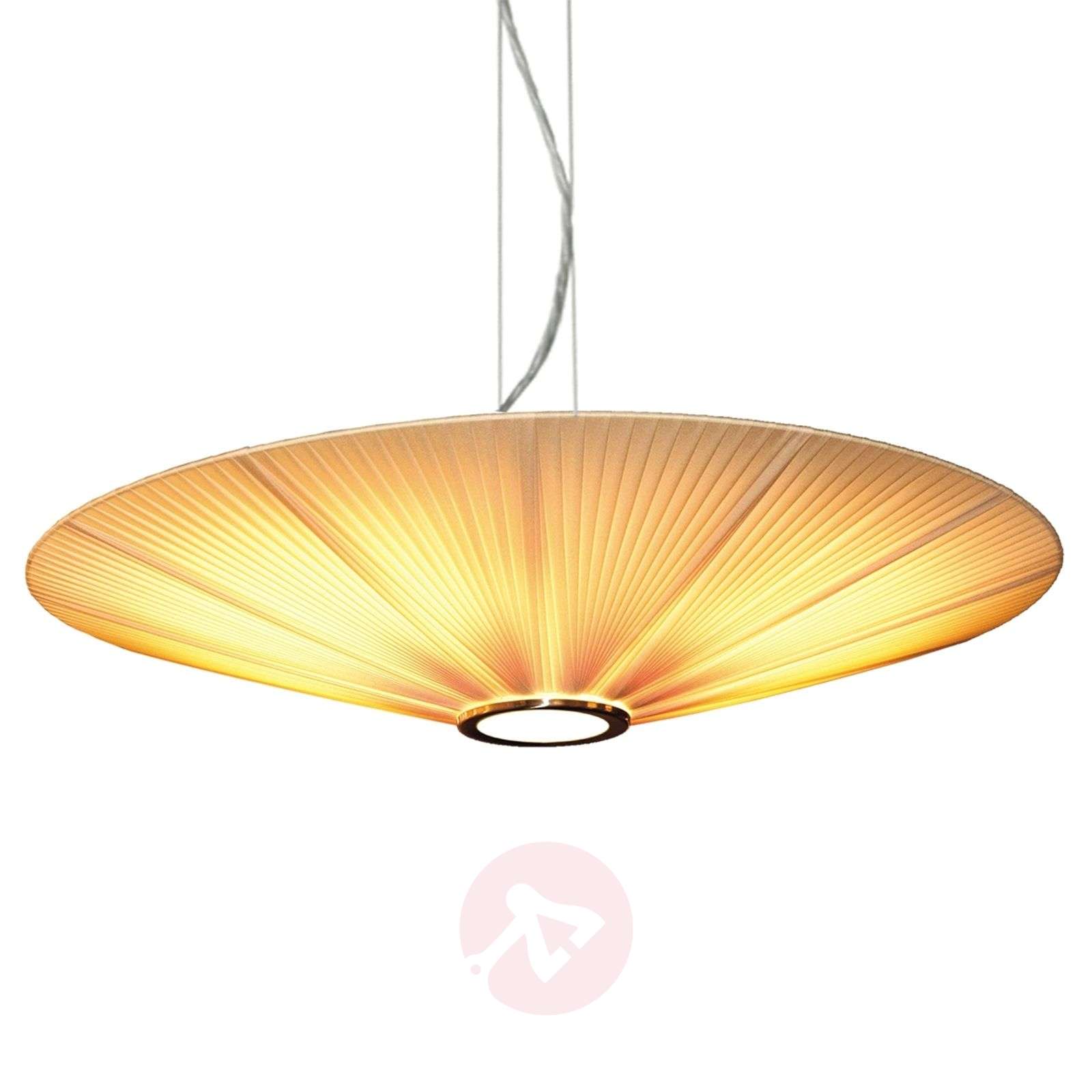 Nowoczesna plisowana lampa wisząca Ufo z nastrojowym efektem oświetleniowym Lampa wisząca Ufo ma duży beżowy klosz z tkaniny o eleganckim, pomarszczonym wyglądzie. Oprawa wisząca oświetla wybrane miejsce zarówno bezpośrednio, jak i pośrednio. Oświetlenie pośrednie skierowane jest z jednej strony w stronę sufitu, a z drugiej strony oświetla atrakcyjny klosz. Dzięki beżowemu zabarwieniu zapewnia bardzo nastrojową i ciepłą atmosferę świetlną. Lampa wisząca Ufo przyczynia się do uzyskania zrównoważonej atmosfery w wielu pomieszczeniach i pasuje do różnych stylów wyposażenia wnętrz. Wyprodukowano w Austrii! Klasa efektywności energetycznej: A++