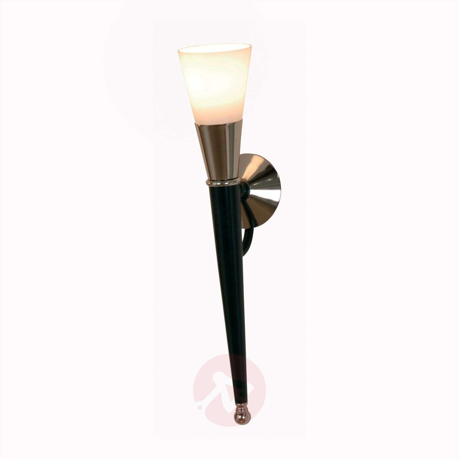 ANTOSA - lampa ścienna w kształcie pochodni w kolorze czerni i chromu ze szklanym kloszem ANTOSA przypomina swoim kształtem kinkiet pochodnię z metalu, trzonek jest polakierowany na czarno, a uchwyt ścienny oraz ozdobne metalowe elementy na rękojeści są utrzymane w kolorze chromu, dzięki czemu lampa prezentuje się modnie. Opalowe białe szkło gwarantuje nieoślepiające światło w łazience obok lustra, w pokoju dziennym lub na korytarzu. Te wysokiej jakości lampy europejskiego pochodzenia są produkowane ręcznie z naturalnych materiałów i charakteryzują się wysoką jakością. Niewielkie ilości produkcyjne pozwalają na zachowanie indywidualności, zagwarantowanie różnorodności oraz tworzenie wyjątkowych produktów. Klasa efektywności energetycznej: A++