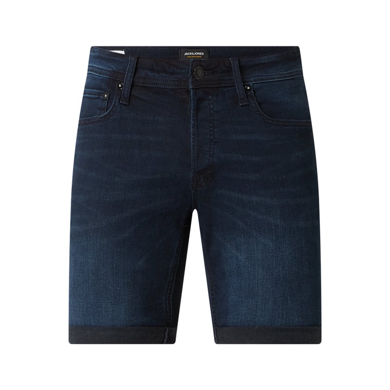 Szorty jeansowe męskie JACK & JONES, Mieszanka bawełny z dodatkiem materiału ekologicznego i elastanem, Krój regular fit , Listwa guzikowa , 5 kieszeni , Nogawka z przyszytym mankietem, Naszywka z logo , Szerokość w pasie w rozmiarze M: 81 cm