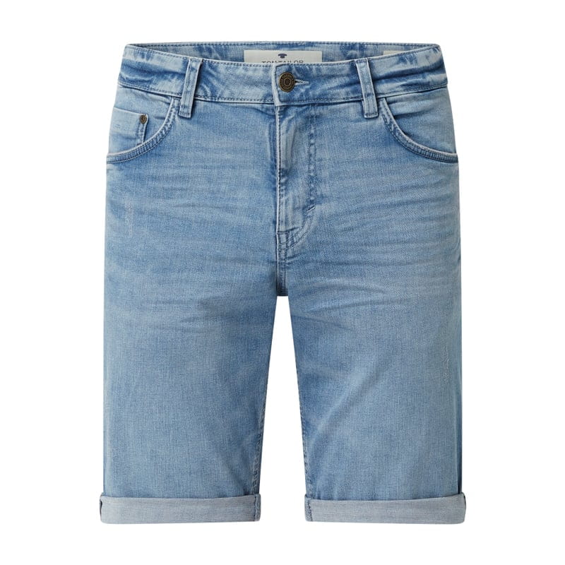 Szorty jeansowe męskie TOM TAILOR , Mieszanka bawełny i elastanu , Krój Regular Slim Fit , Efekt znoszenia , Zapięcie na guzik i zamek błyskawiczny , 5 kieszeni , Naszywka z logo w pasie , Szerokość w pasie w rozmiarze 32: 88 cm