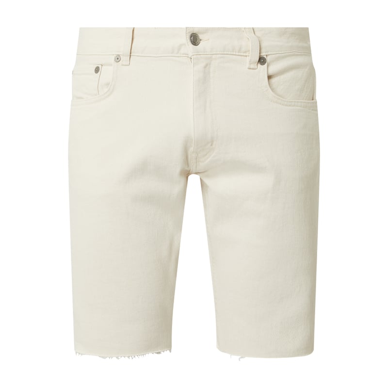 Szorty jeansowe męskie TOMMY x LEWIS , Mieszanka bawełny i elastanu (bawełna ekologiczna), Krój slim fit , Farbowany denim, Zapięcie na guzik i zamek błyskawiczny , 5 kieszeni, Postrzępione brzegi nogawek, Naszywka z logo , Szerokość w pasie w rozmiarze 32: 84 cm