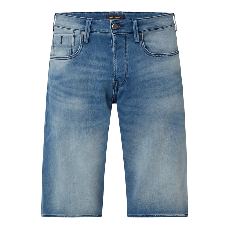 Szorty jeansowe męskie JACK & JONES, Mieszanka bawełny z dodatkiem streczu, Krój loose fit, Listwa guzikowa, 5 kieszeni, Naszywka z logo w pasie, Szerokość w pasie w rozmiarze M: 84 cm