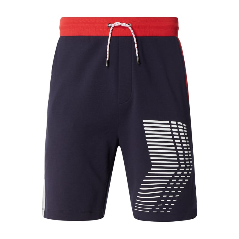 Szorty z dzianiny dresowej męskie HUGO x LIAM PAYNE, Czysta bawełna , Luźny krój , Elastyczny pas z tunelem , Wpuszczane kieszenie , Torba z kieszeniami z wypustką z nadrukiem z logo , Wstawki w kontrastowym kolorze , Zakończenia nogawek z rozcięciem