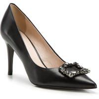 Szykowne szpilki damskie o nosku zakończonym w szpic. Ponadczasowy model z biżuteryjnym elementem, wysadzanym kryształkami nada wieczorowym kreacjom blasku. wsuwane szpilki damskie; wykonane w technologii "hand made"; do produkcji modelu zostały użyte najlepsze włoskie skóry; podeszwa w całości wykonana z materiału syntetycznego. skóra naturalna skóra naturalna materiał syntetyczny