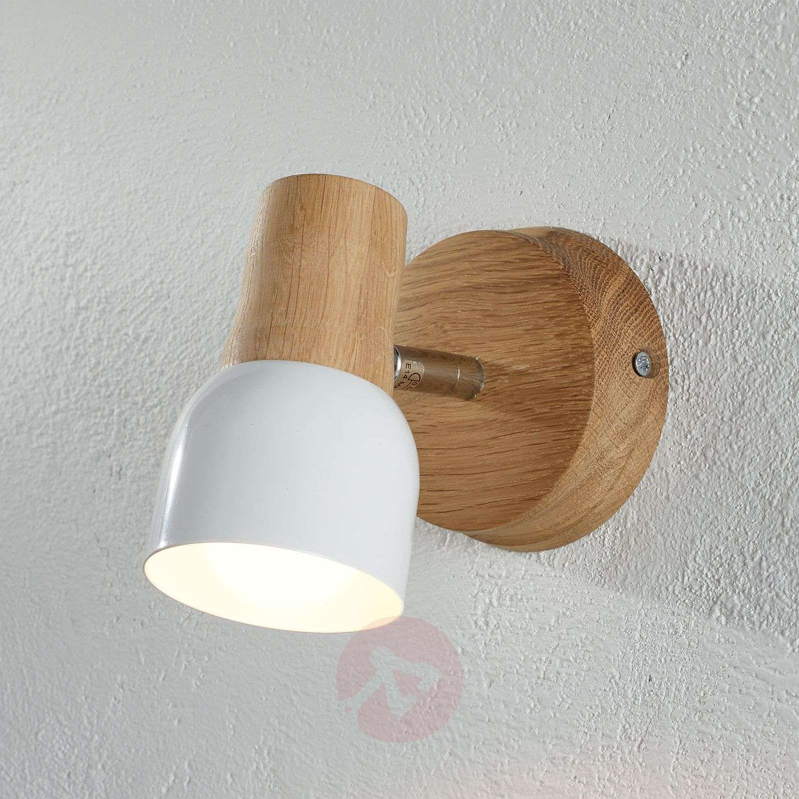 Ozdobny spot ścienny Svantje o naturalnym uroku Ten wykonany z prawdziwego drewna dębowego i białego lakierowanego metalu spot wprowadzi do salonu wspaniałą naturalną atmosferę. Klosz składa się w równych częściach z drewna i metalu – można go regulować w zależności od potrzeb tak, aby światło generowane przez źródło E14 w jego wnętrzu (patrz „Akcesoria dodatkowe”) padało w sposób ukierunkowany. Svantje – przykuje wzrok każdego! Klasa efektywności energetycznej: A++