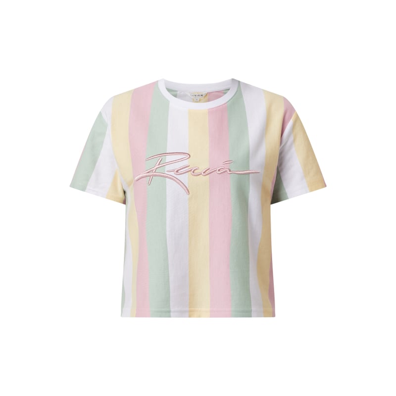 T-shirt damski REVIEW, Czysta bawełna , Pudełkowy krój , Wzór w paski , Okrągły dekolt , Obniżone ramiona , Wyhaftowane logo , Długość tyłu w rozmiarze S: 50 cm