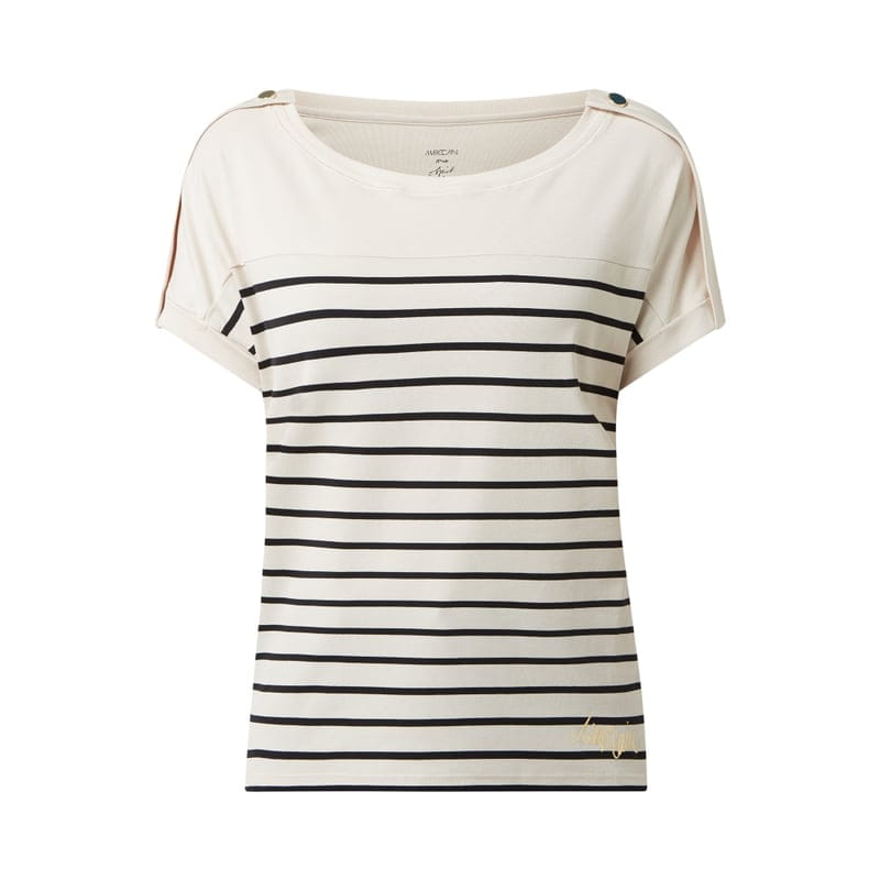 T-shirt damski Marc Cain Collections, Mieszanka bawełny i elastanu, Prosty krój, Wzór w paski, Okrągły dekolt, Ozdobne guziki na ramionach , Zakładka przeszyta na rękawie, Długość tyłu w rozmiarze 36: 60 cm