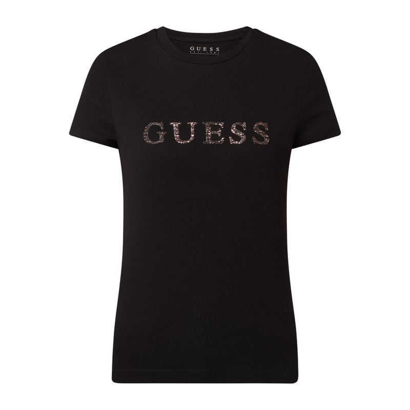 T-shirt damski GUESS, Czysta bawełna , Wąski krój , Okrągły dekolt , Aplikacja z logo , Długość tyłu w rozmiarze S: 58 cm