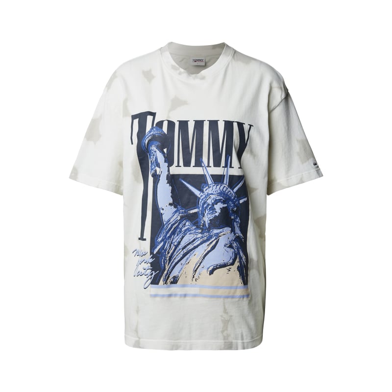 T-shirt damski Tommy Jeans, Czysta bawełna ekologiczna, Krój relaxed fit, Efekt batikowania, Okrągły dekolt z prążkowanego ściągacza, Nadruk z logo, Długość tyłu w rozmiarze S: 68 cm