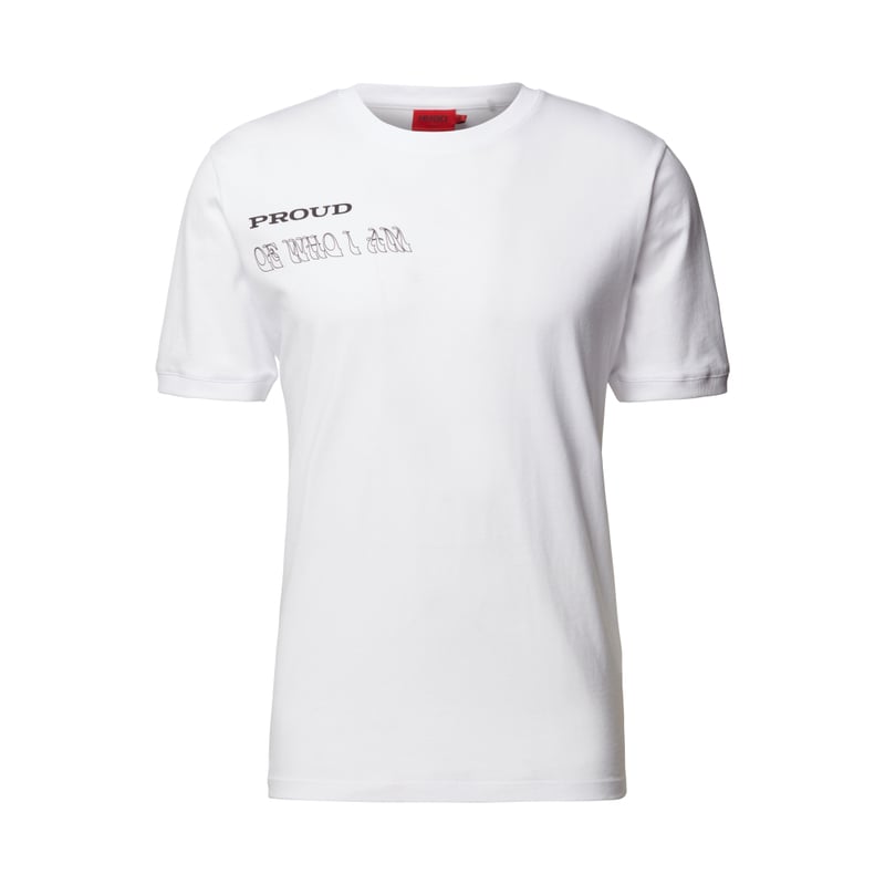 T-shirt męski HUGO, Czysta bawełna, Prosty krój, Okrągły dekolt z prążkowanego ściągacza, Nadruk ze sloganem, Nadruk z logo, Zakończenia rękawów z prążkowanego ściągacza, Długość tyłu w rozmiarze M: 71 cm