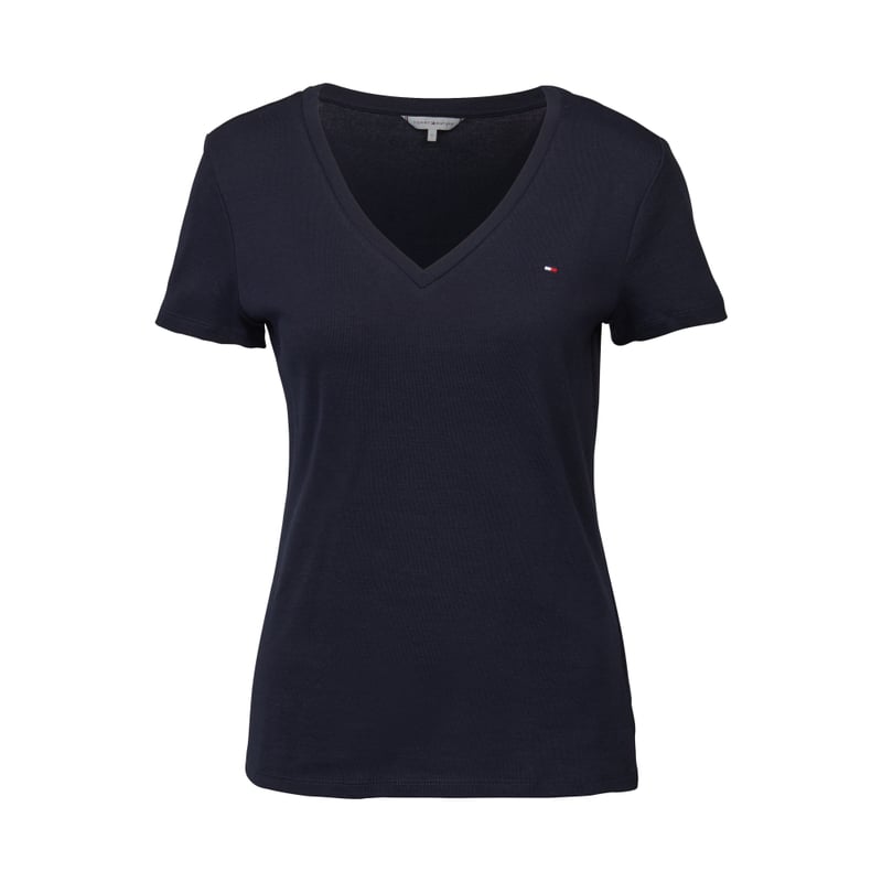 T-shirt damski Tommy Hilfiger, Czysta bawełna, Dopasowany krój, Dekolt w serek, Subtelne, wyhaftowane logo, Długość tyłu w rozmiarze S: 59 cm