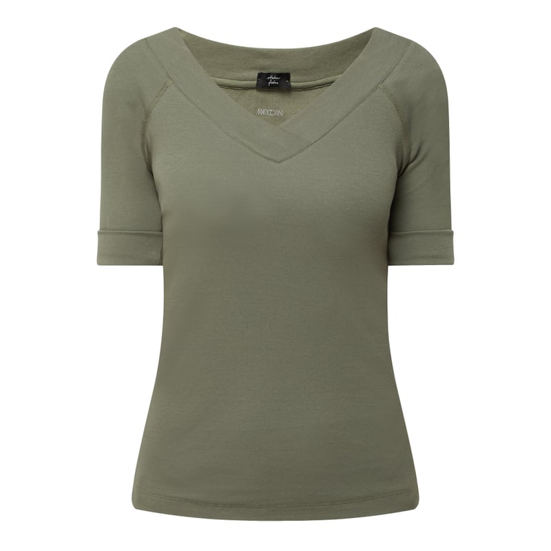 T-shirt damski Marc Cain Sports, Mieszanka bawełny i elastanu, Prosty krój, Drobno prążkowana faktura, Dekolt w serek, Krótkie rękawy raglanowe, Długość tyłu w rozmiarze 36: 50 cm