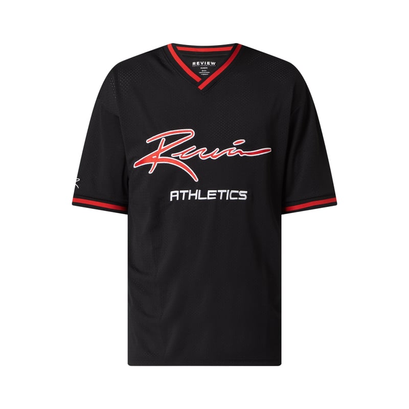 T-shirt męski REVIEW , Wytrzymały materiał , Luźny krój, Delikatna perforacja, Dekolt w serek z wykończeniem w kontrastowym kolorze , Obniżone ramiona, Detale z logo , Długość tyłu w rozmiarze M: 74 cm