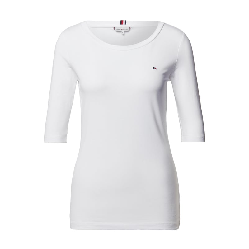 T-shirt damski Tommy Hilfiger, Mieszanka bawełny, Dopasowany fason, Okrągły dekolt, Detale z logo, Długość tyłu w rozmiarze S: 60 cm