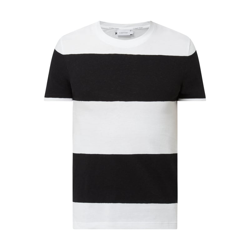 T-shirt męski Calvin Klein, Mieszanka bawełny i lnu, Prosty krój, Wzór w paski , Okrągły dekolt , Długość tyłu w rozmiarze M: 70 cm