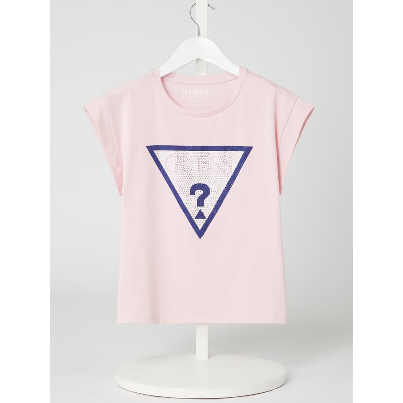 T-shirt młodzieżowy GUESS , Mieszanka bawełny i elastanu , Luźny krój, Okrągły dekolt , Nadruk z logo z kamieniami stras, Długość tyłu w rozmiarze 152: 41 cm