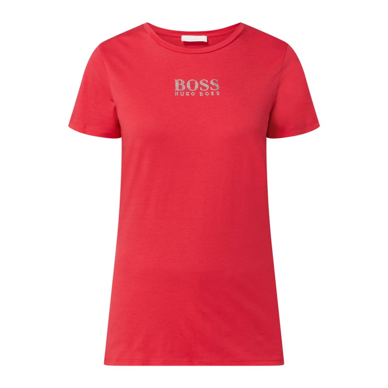 T-shirt damski BOSS, Czysta bawełna ekologiczna, Prosty krój, Okrągły dekolt, Logo z kamieniami stras, Długość tyłu w rozmiarze S: 61 cm