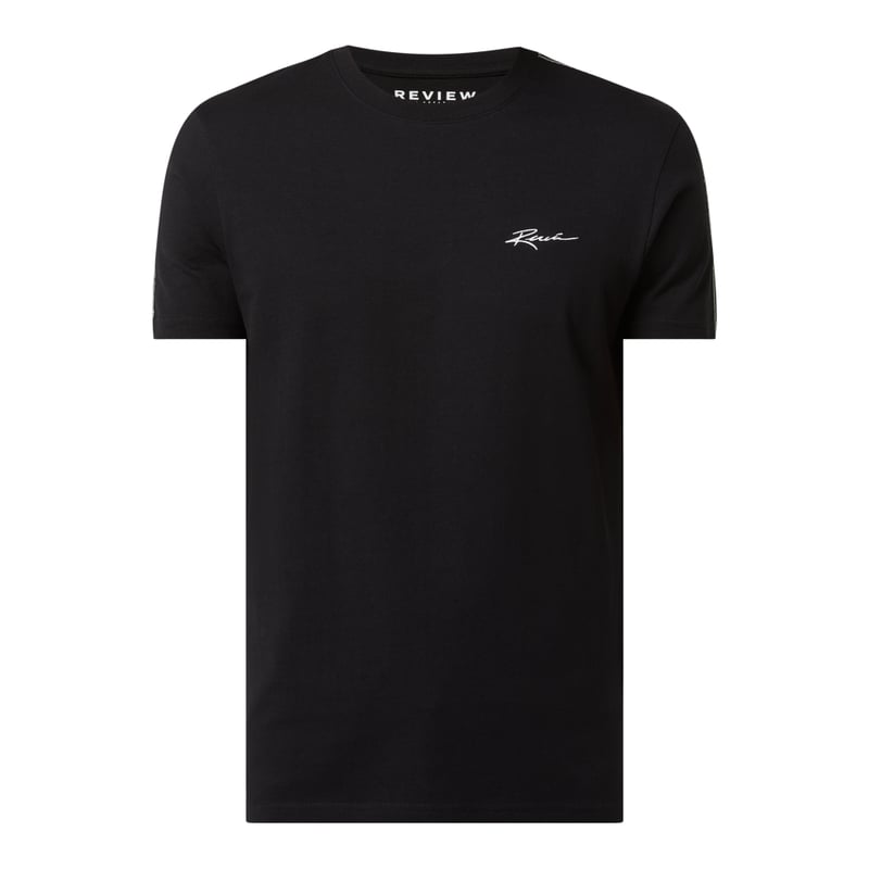 T-shirt męski REVIEW , Czysta bawełna , Prosty krój , Okrągły dekolt , Wyhaftowane logo, paski z logo, Długość tyłu w rozmiarze M: 72 cm