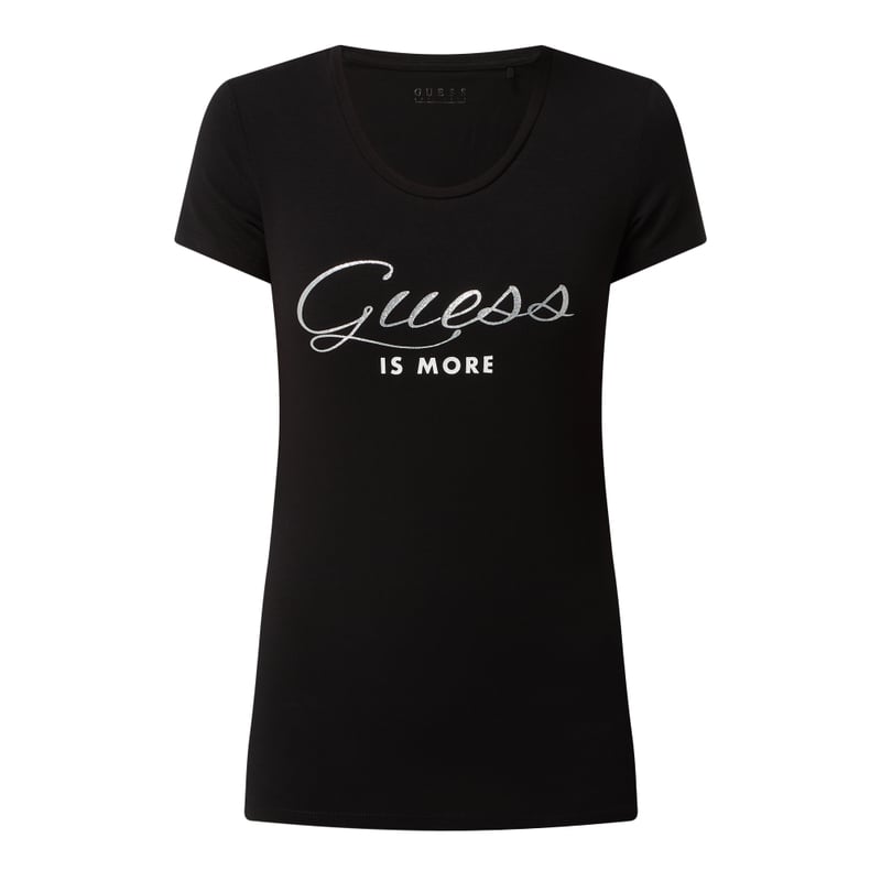 T-shirt damski GUESS, Mieszanka bawełny i elastanu, Taliowany krój, Okrągły dekolt, Logo z efektem błyszczącym, Długość tyłu w rozmiarze S: 55,5 cm