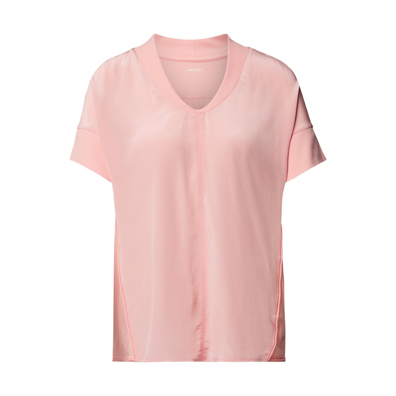 T-shirt damski Marc Cain, Mieszanka bawełny, Luźny fason, Zaokrąglony dekolt w serek, Szew po środku, Szwy w stylu inside out, Prążkowane wykończenia, Długość tyłu w rozmiarze 36: 60 cm, Długość rękawa w rozmiarze 36: 10 cm