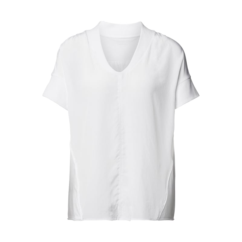 T-shirt damski Marc Cain, Mieszanka bawełny, Luźny fason, Zaokrąglony dekolt w serek, Szew po środku, Szwy w stylu inside out, Prążkowane wykończenia, Długość tyłu w rozmiarze 36: 60 cm, Długość rękawa w rozmiarze 36: 10 cm