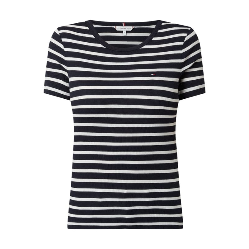 T-shirt damski Tommy Hilfiger , Mieszanka modalu z dodatkiem bawełny i streczu , Taliowany krój , Wzór w paski , Okrągły dekolt , Logo , Długość tyłu w rozmiarze S: 60 cm