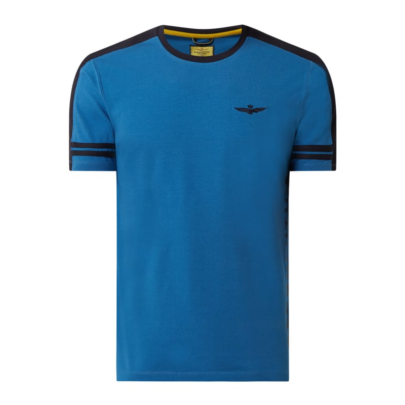 T-shirt męski Aeronautica Militare, Mieszanka bawełny i elastanu , Dopasowany krój , Okrągły dekolt , Paski w kontrastowym kolorze , Nadruki , Długość tyłu w rozmiarze M: 66 cm