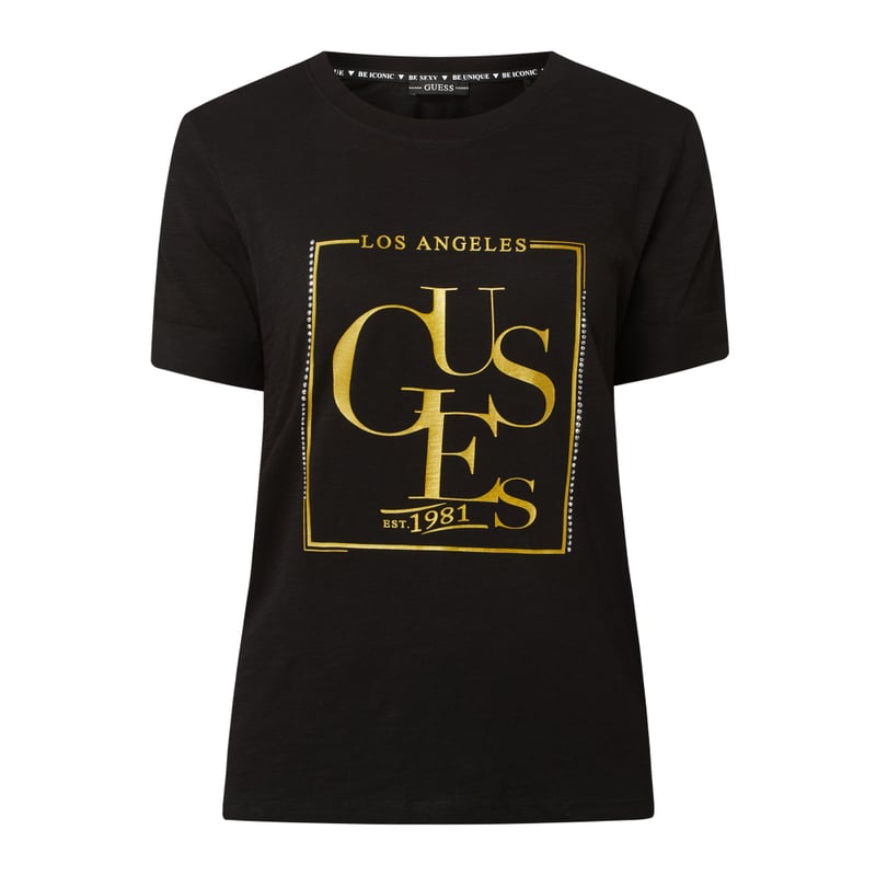 T-shirt damski GUESS , Czysta bawełna , Prosty krój , Okrągły dekolt , Nadruk z logo , Długość tyłu w rozmiarze S: 57 cm