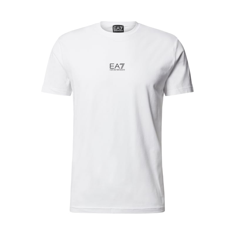 T-shirt męski EA7 Emporio Armani, Mieszanka bawełny i elastanu, Krój regular fit, Okrągły dekolt z prążkowanego ściągacza, Centralnie położony nadruk, Długość tyłu w rozmiarze M: 70 cm