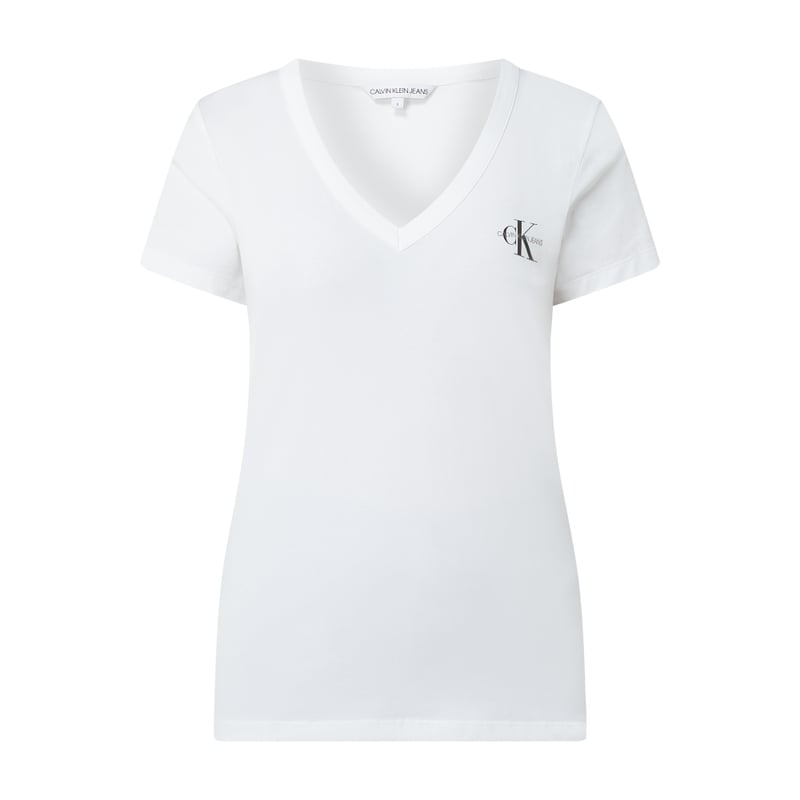 T-shirt damski Calvin Klein Jeans, Mieszanka bawełny z bawełną ekologiczną i dodatkiem streczu , Taliowany krój, Dekolt w serek, Nadruk z logo, Długość tyłu w rozmiarze S: 59 cm