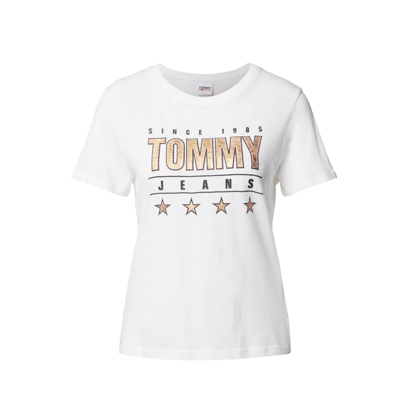 T-shirt damski Tommy Jeans, Czysta bawełna, Krój regular fit, Okrągły dekolt z prążkowanego ściągacza, Nadruk w kontrastowy kolorze, Detale z logo, Długość tyłu w rozmiarze S: 58 cm