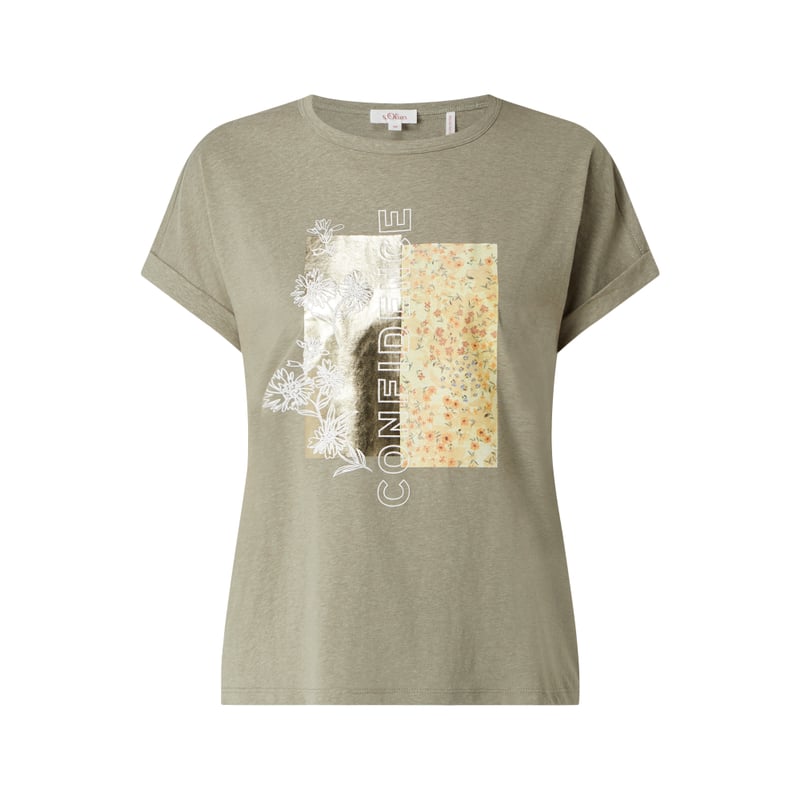 T-shirt damski s.Oliver RED LABEL, Mieszanka materiałów z dodatkiem bawełny i wiskozy , Prosty krój , Okrągły dekolt , Napis , Kwiatowy nadruk z metalicznymi detalami , Długość tyłu w rozmiarze 36: 60 cm
