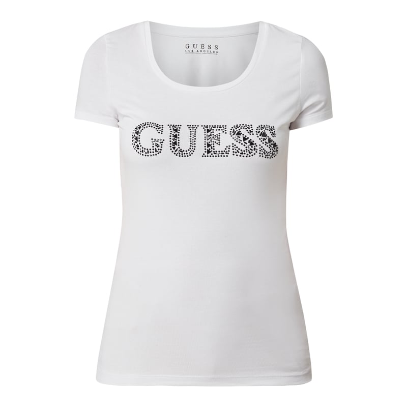 T-shirt damski GUESS, Mieszanka bawełny i elastanu , Wąski krój , Okrągły dekolt , Aplikacja z logo z nitów, Długość tyłu w rozmiarze S: 60 cm