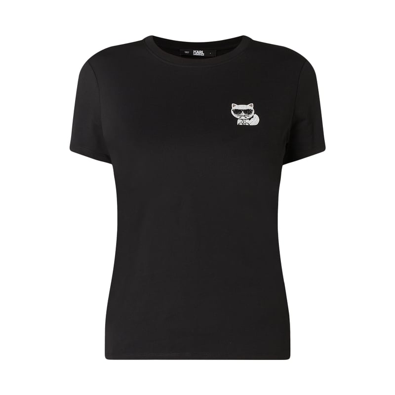 T shirt damski KARL LAGERFELD , Czysta bawełna , Luźny krój , Okrągły dekolt z prążkowanego ściągacza , Ozdobne kamienie , Logo z tyłu , Długość tyłu w rozmiarze S: 57 cm
